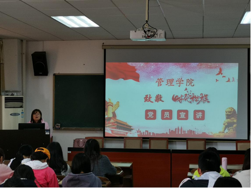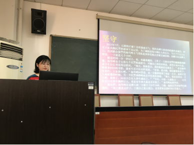 接下来管理公司分支部派代表上台进行了时代楷模事迹的宣讲。一支部由徐诚、吴优和刘琳分别讲述南仁东、杜富国和张富清的英雄事迹,他们通过ppt展示了英雄们淡泊、坚持、爱国和奉献的精神。二支部代表顾成雪用清晰干净、饱含热情的声音讲述了南东仁、杨雪峰和刘传建的英雄事迹,从这一个个的故事当中,让人感受到了拼搏奋斗的美丽,激发着全体党员为建设美丽祖国奉献自我的热情。三支部代表李金霖讲述了龚全珍、毛秉华和毛浩夫的英雄事迹,他的宣讲激情昂扬,结合配乐声和ppt,使大家对毛秉华、毛浩夫父子对井冈山红色精神的传承有了更深刻的认识。四支部由宋嘉好讲述了杜富国、陈俊武和卢永根的英雄事迹,她通过微视频播放和ppt宣讲,让同学们感受到了杜富国自强、勇敢、坚决和勤劳的精神,陈俊武攻坚克难、矢志创新的精神和卢永根在永葆初心、矢志奋斗中体现的爱国情怀。