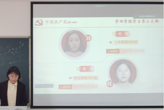 随后,新党员代表作表态发言。“能够成为预备党员十分荣幸,我知道自己还存在许多不足与缺点,我也将铭记老师、同学们和党组织的帮助和培养,未来不负使命,请党放心,强国有我!”来自物流管理2002班的盛晓林同学这样说到。