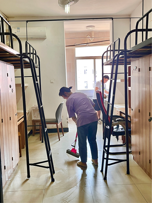 各位员工党员分工有序,快速投入到打扫工作中,有条不紊地进行着宿舍清扫。在打扫过程中,党员们不怕苦不怕累,用自备的扫帚、抹布、拖把,对地面、桌子、阳台以及厕所进行了细致的清理,使新生寝室焕然一新。