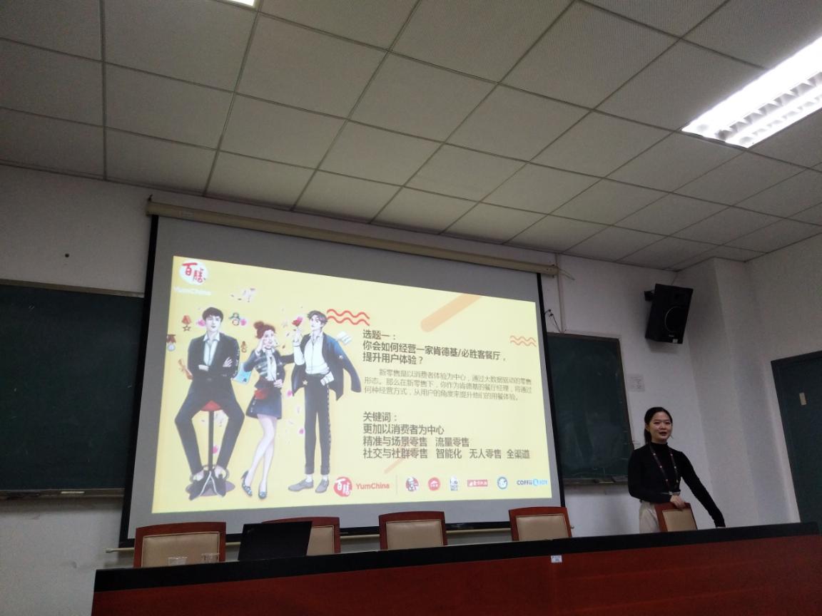 1月8号下午,管理公司工商管理专业全体同学在G-505召开专业实习分享会。百胜(中国)控股有限公司长沙分公司人力资源总监戴福欣,人力资源部区域经理方明、招聘经理夏毓佳、管理公司副经理余博及工商管理教研室主任高杰及胡琳、蒋萍老师参加了此次专业实习分享会。
