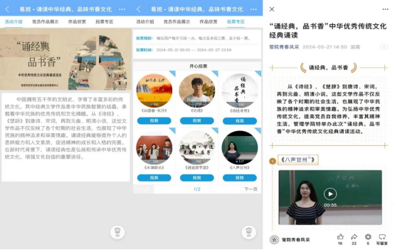 公司易班管理中心和各班的积极发动下,各班同学积极响应,认真选择经典书籍进行朗诵视频拍摄。在收到的视频中,经典的篇章如美妙的乐章在空气中回荡《论语》的智慧、《诗经》的风雅、唐诗宋词的韵味,一一展现在众人面前,同学们用自己的方式诠释着经典的魅力,让这些古老的文字焕发出新的活力。收到的视频作品筛选出优秀作品放至易班平台进行展示投票还通过公司微信公众号“管院青春风采”进行宣传和推广,不仅收获了师生们的一致好评,同学目睹文化盛宴师生好评如潮物流管理2101班王震宇同学在欣赏完相关作品后感慨“我很自豪有如此优秀的传统文化供我们学习,以后我要向先辈们看齐,将中国优秀传统文化发扬光大!”最后,为期六天的投票结束,易班管理中心将投票结果进行公示,分别评出最受欢迎奖1项,最具表现奖5项,本次活动圆满落幕。