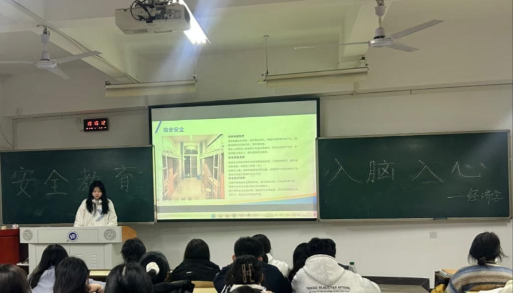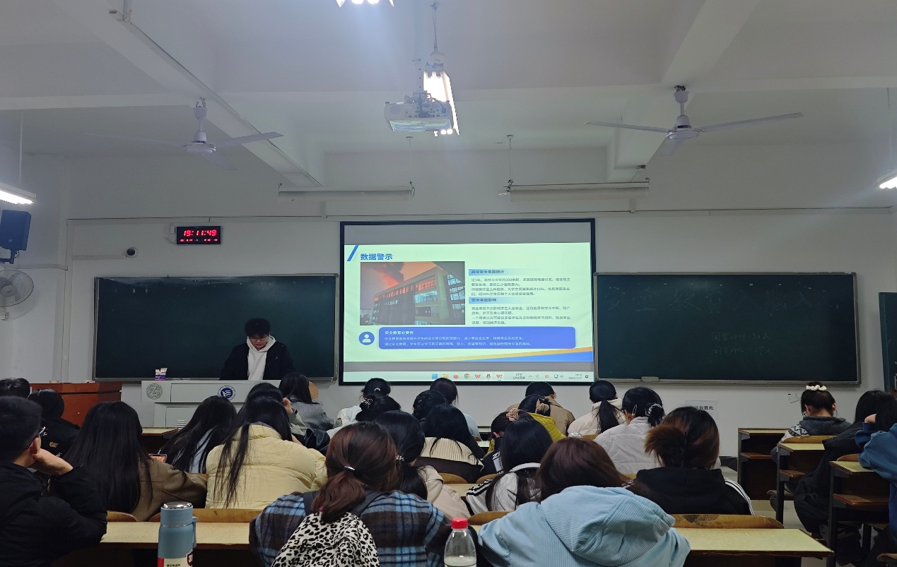 班会伊始,安全督察部部长钟奇磊以近期社会热点安全事件为切入点,结合校园实际,围绕交通安全、消防安全、网络安全以及食品安全等多个方面展开详细讲解。在交通安全板块,通过播放交通事故视频,直观呈现违规出行的严重后果,强调遵守交通规则的重要性;消防安全环节,干事们现场演示灭火器的正确使用方法,普及火灾发生时的逃生技巧;针对网络安全,结合当下常见的网络诈骗案例,教导同学们如何辨别网络陷阱,保护个人隐私。