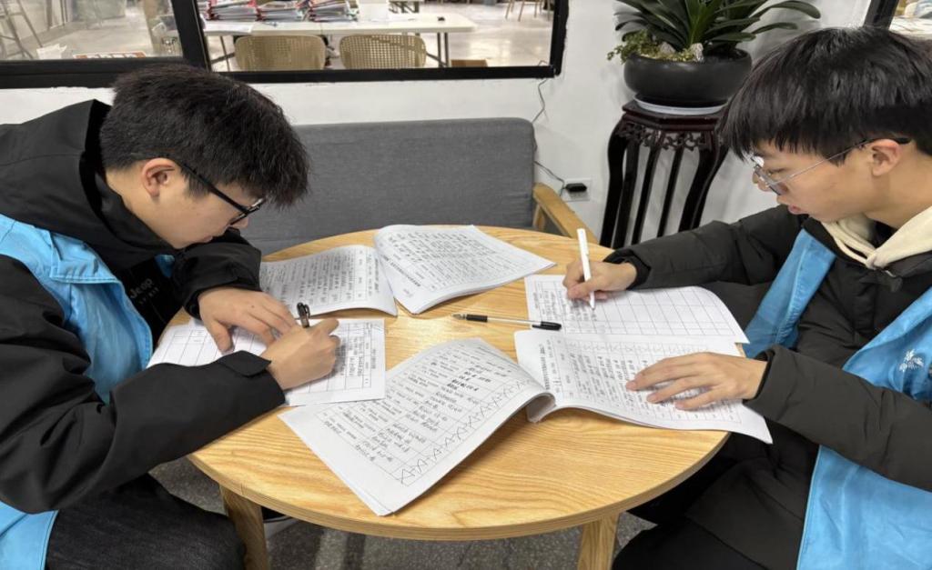 (图注:志愿者们帮助心智障碍者写作业)
