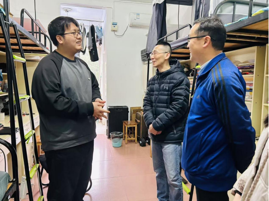 3月14日上午,XCSport经理刘主光、党委副书记谭超、员工工作办公室主任周舟妤栎来到亲民2栋209室看望即将捐献造血干细胞的数字经济2202班罗旋同学。