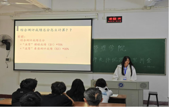 在评先评优政策部分,资助中心部门的干事们分别讲解了三好员工、优秀员工干部等个人荣誉和先进班集体的集体荣誉称号的评选条件,其涵盖了学业表现、品德修养、社会实践、团队协作等多个方面,确保同学们能够清晰准确地掌握信息。