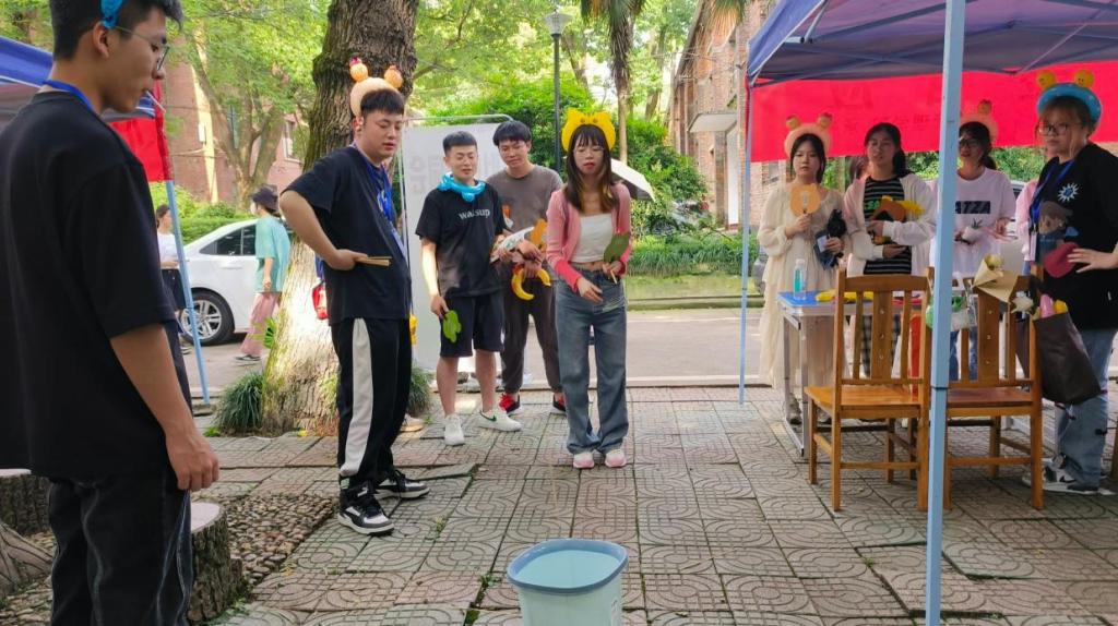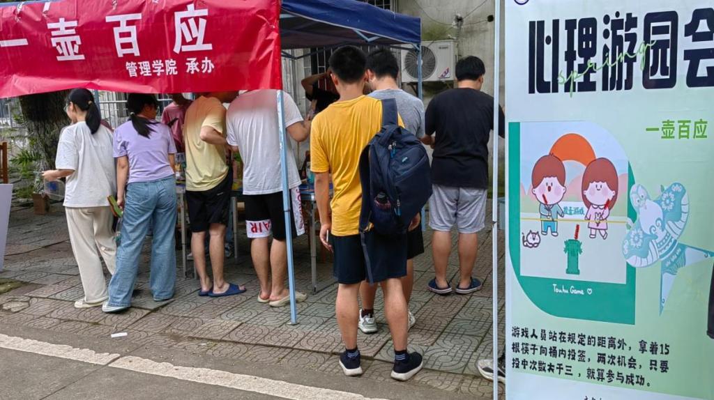 此次心理游园会活动具体包括"趣味弹珠"、 "杯子叠叠乐"、 "你画我猜"、"一壶百应"等多个游戏区域。在管理公司员工联合组织承办的“一壶百应”游戏区域中,同学们有序排队参与,游戏中的同学手拿竹签,尽力将竹签投入相隔几米处的小桶中,若十根签中投入三根则视为过关。“投壶”游戏不仅考验同学们对准心和力度的把握,更考验同学们的耐心和心态。活动中,同学们奔走于各个游戏区域间,在竞争与合作中逐渐拉近彼此的距离,游园会的会场充斥着同学们的欢声笑语。