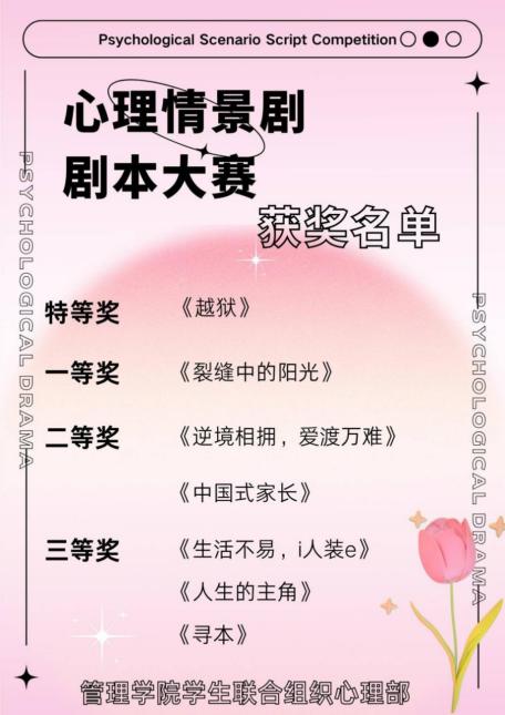 为加深老员工对心理情景剧的认识与了解,提高老员工对自身心理健康的关注,XC体育管理公司于10月中旬举办第三届心理情景剧剧本大赛。此次大赛由管理公司员工联合组织心理部承办,面向管理公司全体同学。经评审团综合考量评选,共选出特等奖一名,一等奖一名,二等奖两名,三等奖三名。