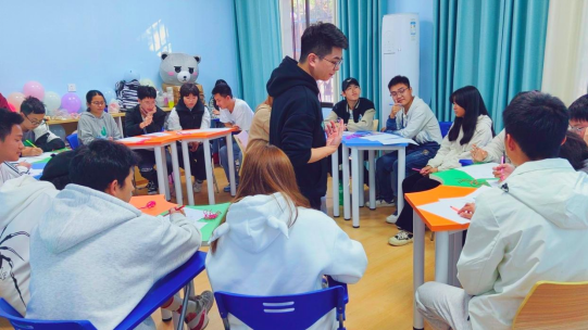 活动伊始,罗蒙老师向同学们介绍此次团体辅导活动开展的目的及意义,并强调团辅活动的自由、平等、保密原则,并引导同学们进行自我介绍。活动期间,同学们在罗蒙老师的指引下通过“丘比特红线”环节分为十队,并共同创作爱情cp名与爱情宣言。其中“爱情几何图”环节中,同学们用几何图形组成自己认为爱情的模样并与小组成员进行介绍分享。“爱情OH牌”环节,同学们根据自己的理解展示抽取的两张OH牌,并探索卡牌中与爱情相关的故事。“背对背创作”与“气球保卫战”环节在小队成员的默契协作下顺利进行,欢声笑语充满了团体辅导室。活动最后,每位同学在时光卡片上写下自己对爱情的理解与期待,并将卡片保留作为纪念,在同学们的积极配合下,此次团体辅导活动圆满完成。