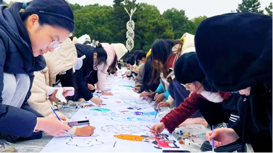 活动伊始,管理公司心理部成员组织同学们在知行广场集合,并向同学们讲解此次活动的参与形式与注意事项。活动期间,同学们遵守规则、积极参与,认真在画卷上进行大胆创作,并与周围的同学分享自己的作品与创意。在同学们大胆地想象与认真地创作下,各类画面生动、内容精彩的绘画作品展现在百米画卷上,共同组成一幅丰富特别的画作。活动现场气氛活跃,场地上充满同学们的欢声笑语,在同学们的热烈反响下,此次百米画卷活动圆满完成。