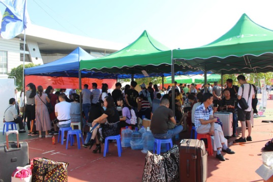 原本安静的校园,一下子变得热闹起来。知行广场上家长们整齐停放的汽车,明德楼前行李箱和急促的脚步声,体育馆各种各样的红色迎新横幅。公司员工会成员积极且有条不紊的工作着,解答家长们的疑惑,帮助新生完成报名及入住工作,还有热心的学长学姐主动帮新生搬运行李。截至9月16日,管理公司已报到新生445名,报到率高达98.67%,位居全校第一!