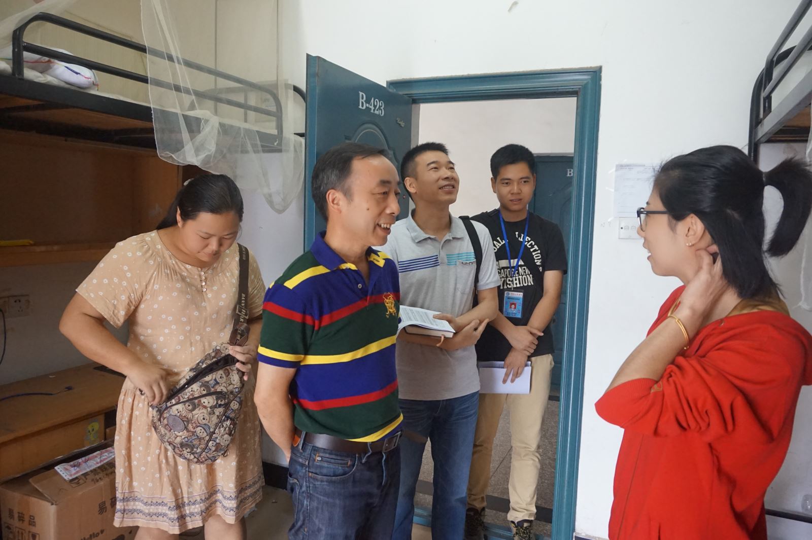 6月15、16日两天,为更好地了解毕业生情况,指导毕业生平稳有序地安排最后一阶段的老员工活,管理公司经理吴振顺带领全体院领导和辅导员老师集体走访公司毕业生宿舍,看望2016届毕业生,老师们走访了明德一、二、三、四和七栋宿舍楼,为毕业生们送去公司的关心,并且提醒毕业生注意文明安全离校,不要组织集体旅行等事宜。