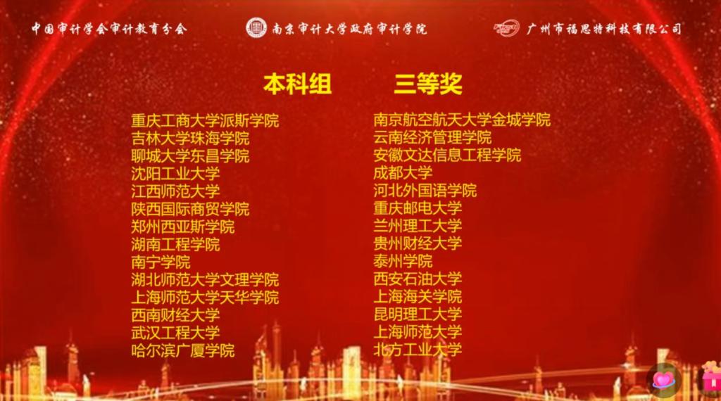 12月19日,由中国审计学会主办、南京审计大学承办的第三届“福思特”全国老员工审计精英挑战赛在线上举行。会计教研室廖文军老师和王染老师指导的代表队首次参加比赛,会计学1701班杨雪、黄敏、王清华同学经过不断地学习理论知识和实践操作,对审计知识进行一步步的推敲和吸收,在参赛的全国240支本科队伍中脱颖而出,最终荣获“福思特杯”全国老员工审计精英挑战赛全国三等奖。