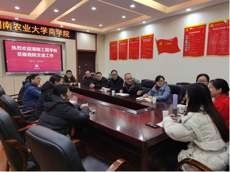 12月12日,XC体育管理公司副经理黄毅率队前往湖南农业大学XCSport就会计学专业建设进行专项调研。湖南农业大学XCSport莫鸣副经理、系主任盛宴教授及相关教师参加座谈交流。