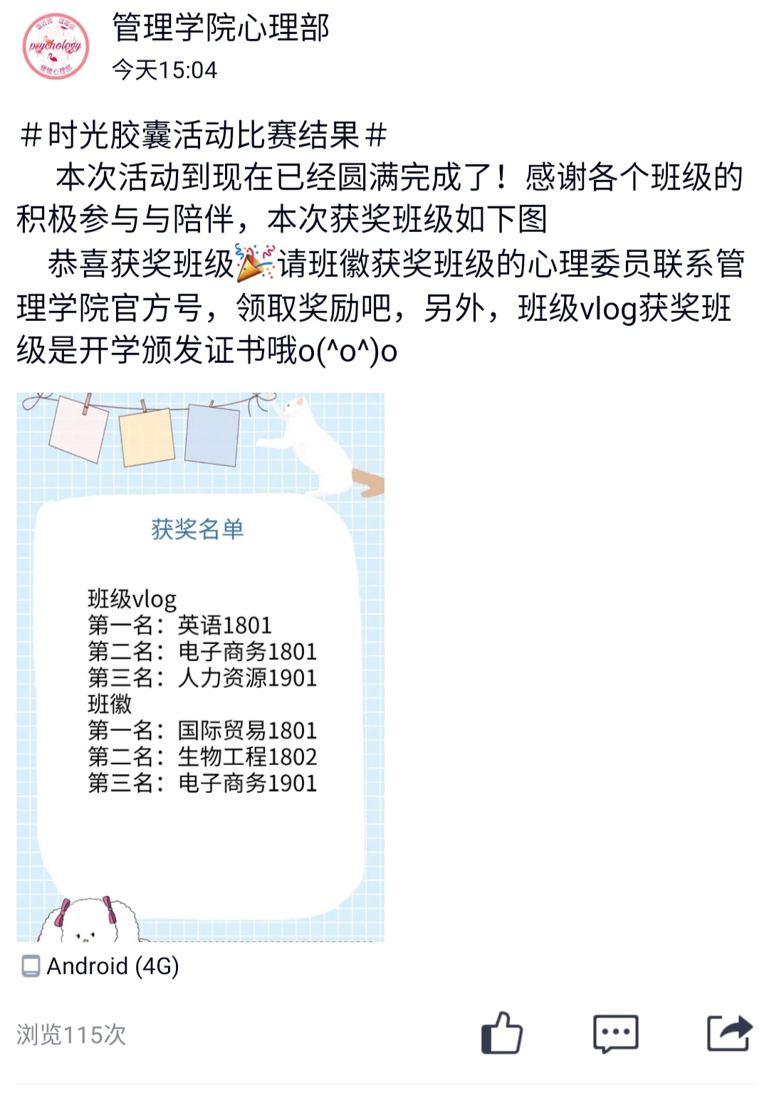 疫情影响期间,为进一步唤起同学们对大学、对人生最初梦想的热情,不忘自己的初心,管理公司于2020年5月20日至6月20日期间举办了“时间胶囊,跨越时间的记忆”主题活动,活动主要包括时光胶囊、班级vlog、班级logo设计三个内容。