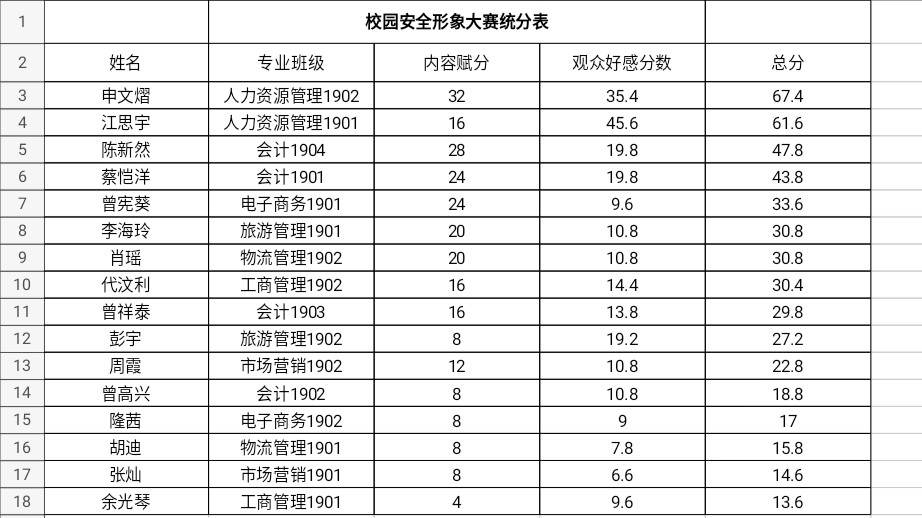 大赛后期,管理公司团总支员工联合会安全督察部的成员及观众对参赛人员作品进行了投票。以观众好感分数+内容赋分=综合分数来进行排名,依次可得相应票数。个人积分赛将采取一分一票的模式,观众分数占总票数的60%,内容赋分占总票数的40%。最终决出了此次大赛的冠亚季军(见下表),他们将作为校园的安全形象大使。同时其他参赛人员也表现优异,此次大赛圆满落幕。