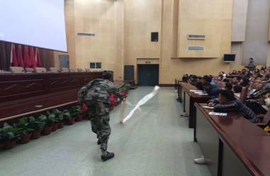 王骏以幽默风趣的开场吸引了所有同学的注意,他首先从员工的日常生活开始讲起,为大家指出了教学楼、图书馆等地方的安全通道,又通过一些具体实例阐述了老员工应该如何增强自己的安全防范意识。其次,重点强调了在老员工活中的防火防盗问题,并现场教授大家平时该如何防预防,遇到突发情况时该如何处理的方法,让大家受益匪浅。最后强调了员工在平时生活中的安全问题,如交通安全、网络安全、购物安全、推销陷阱、各种诈骗等问题,并通过图文并茂的真实案例给大家以警示。王老师邀请了国旗护卫队的队员们现场演示消防器材的使用,如何使用消防器材时,同学们在台下目不转睛,认真学习。在一片欢声笑语中同学们了解了防火的重要性、如何防止火灾的发生以及火灾发生时的处理措施,讲座顺利结束。