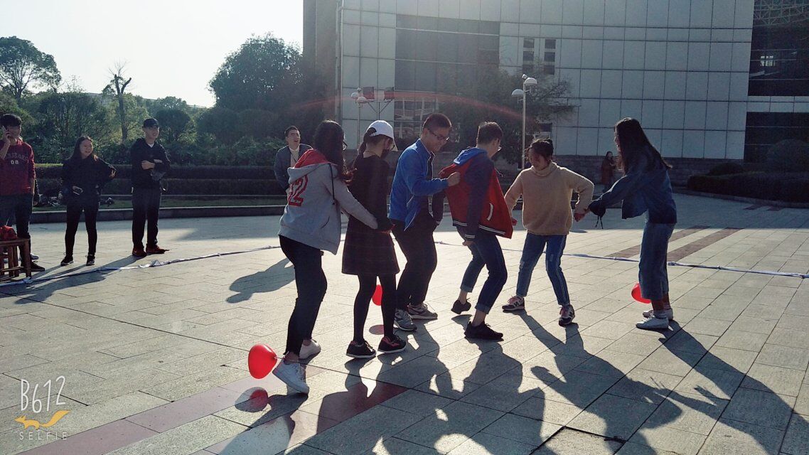 下午四分之一决赛的游戏有“踩气球”、“猜歌名”、“逛园子”。“踩气球”每个部门需要两名成员,一个人腿上绑气球,另一个站在绑气球那个人前面保护气球。然后部门间对战,最后气球没被踩破的获胜。相应的部门加一分。