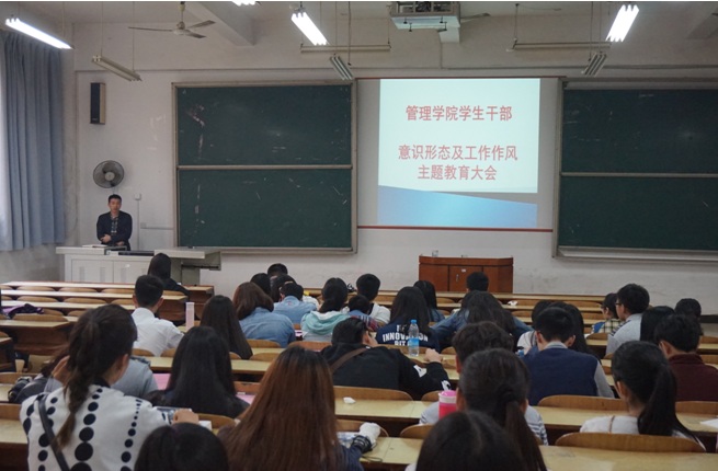 4月14日中午12点, 管理公司在主校区教学楼D101举办 “员工干部‘意识形态’及‘工作作风’主题教育”大会。公司党总支副书记钱祖煜、全体学办老师出席了此次会议,公司全体员工会干部及各班班长、团支书参加了此次大会,认真参加学习。