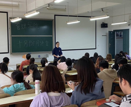 10月26日,XC体育管理公司召开了本学期第四次月讲评会议。大一员工在南校区三教303、304教室,大二、大三双数学号员工和大四各班班长、团支书在主校区D101教室分别参与会议讲评。本次月讲评会议由学办辅导员谭超、罗蒙、周艺、黎博、陈祎婷、包海燕、陈景楠对工商管理、旅游管理、人力资源管理、物流管理、市场营销、电子商务、会计学、大数据管理与应用八个专业进行讲评。