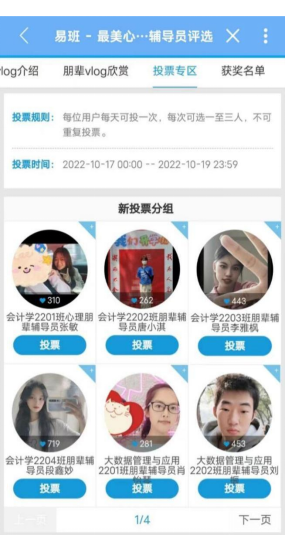 活动首先由各朋辈记录下军训生活的点点滴滴,并将其制作成Vlog视频,对新生的军训生活进行总结。然后,心理部收集各朋辈的视频,由易班管理中心进行仔细的视频审核工作,并搭建好作品展示平台并将其呈现在易班app上。管理公司全体员工于10月17日开始对自己心仪的朋辈辅导员进行投票。此次活动公司同学积极参与,最后根据得票情况选出特等奖两名,一等奖三名,二等奖四名,三等奖五名,优胜奖五名,获奖名单附下。