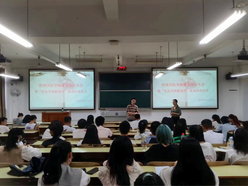 为了能够更好地建设良好的院风、学风,培养德智体美劳全面发展的社会主义建设者和接班人。11月11日下午,管理公司召开学风建设动员大会暨“优良学风建设月”活动启动仪式在104会议室召开,党委副书记谭超、辅导员李林老师出席,管理公司全体学习委员、学风建设小组干部及干事到场参加。