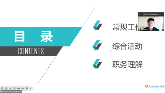 12月19日下午14时,为总结本学期员工会的各项工作成果,加强对员工会工作人员的管理,进一步制定来期工作方针,为来期的员工会工作做铺垫。管理公司在线上召开员工会工作人员述职评议会议,团总支书记彭小玲、员工联合组织主席团、部长团全体人员参加了本次会议,会议由易班管理中心主任段妙鑫主持。