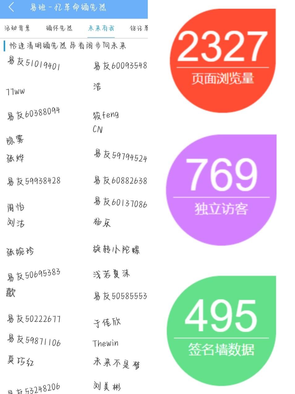 活动以易班APP为依托,搭建“忆革命 缅先烈”主题平台,在该平台以H5的形式通过图片、文字、视频等介绍革命先烈及其英勇事迹,员工在充分了解革命先烈艰苦卓绝的斗争经历后,可在“未来有我”签名墙上签名。便捷且仪式感满满的活动形式吸引了广大青年员工主动参与,并在公司员工群体中引起热议。据后台数据显示,共计3591人次浏览并参与活动。与此同时,公司组织开展“恰逢清明缅先烈,昂首阔步向未来”主题班会,利用PPT展示、播放影片等方式,使广大青年学子进一步了解感悟革命先烈面对困难英勇斗争、勇往直前的大无畏精神。