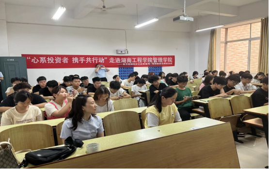 为落实“投教进百校”宣传活动,提高同学们对非法证券以及各类诈骗方式的鉴别能力和防范意识,更好地构建“平安和谐”校园,6月20日下午,申万宏源证券湖南分公司湘潭建设北路营业部举办了“防非反诈”讲座,此次讲座面向管理公司工商管理22级同学,在主校区教学楼C座102教室开展具体讲座活动。