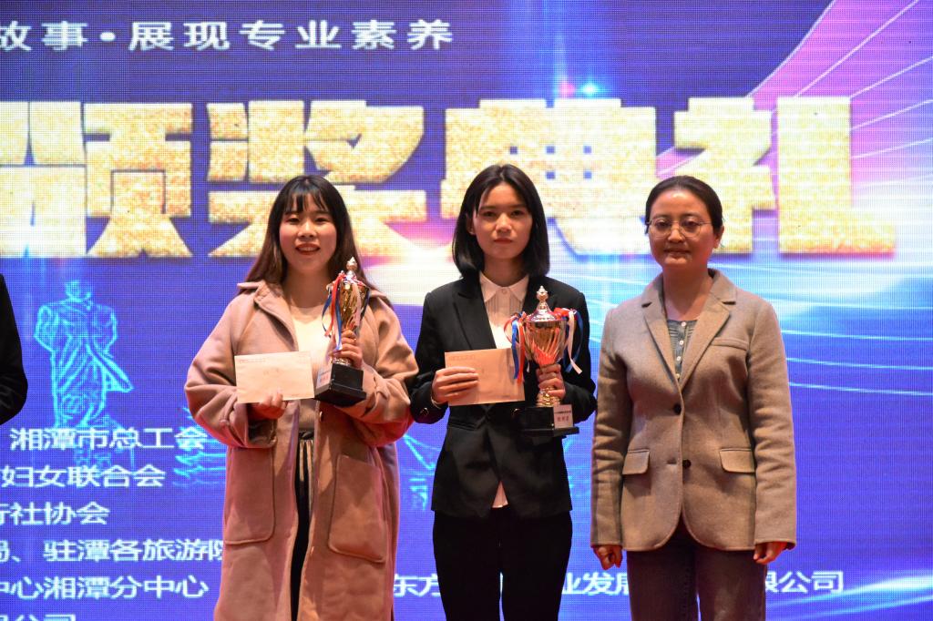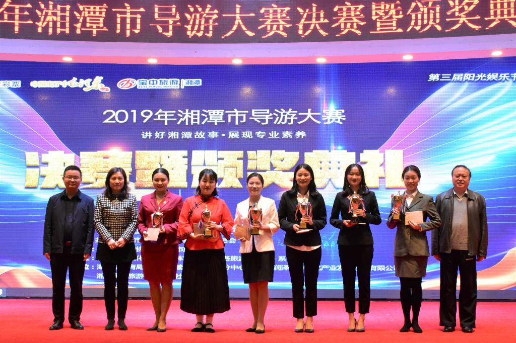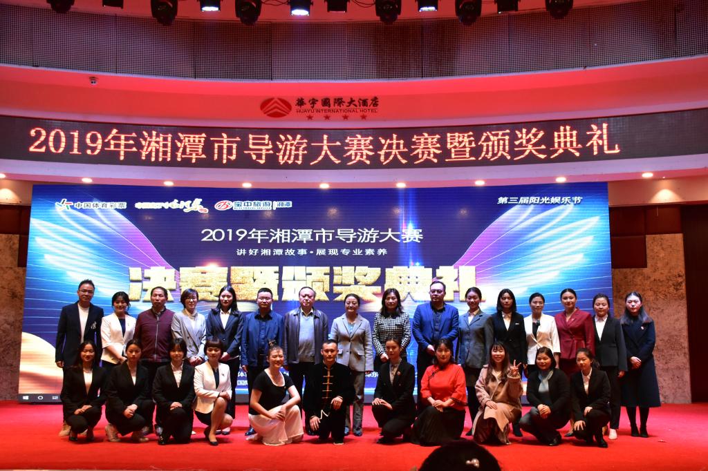 决赛当晚,湘潭市文化旅游广电体育局党委书记、局长张湘汉、湖南省文化和旅游厅市场管理处副处长常炼、湘潭市文化旅游广电体育局副局长王霓等多位领导应邀出席本次大赛。大赛以“讲好湘潭故事,展现专业素养”为主题,通过“理论笔试”、“风采展示”、“模拟导游讲解”和“才艺展示”四个环节的激励比拼,公司旅游管理17级罗娜、朱晓晓同学斩获银牌,旅游管理18级鲁灿辉、17级杨晓萱、余美琴同学获铜牌,乔敏雪同学获优秀风采奖,XC体育获“突出贡献单位”奖。