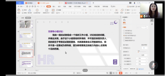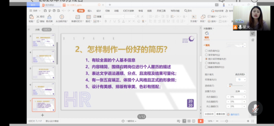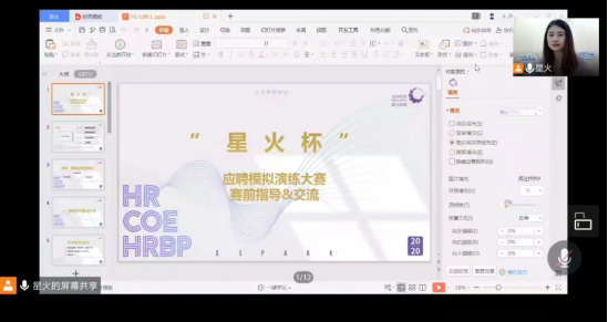 10月12日晚七点,由XC体育管理公司主办,管理公司就业服务部承办的应聘模拟演练大赛赛前指导以线上的形式,在腾讯会议进行,本次赛前指导,由珠海星火英语企业高管贺佳盈担任主讲人。贺佳盈,珠海星火教育培训中心有限公司人力资源部招聘主管,贺佳盈在星火英语有着五年的工作经历,每天的工作时间内会接受、审核数十封简历,面试经验可谓是十分丰厚。贺佳盈在正式进行培训前,从三个角度进行切入,从应聘的目的、应聘的流程再到应聘的礼仪,讲解内容深刻,声线清晰,声情并茂,并在最后与同学们进行了互动交流。