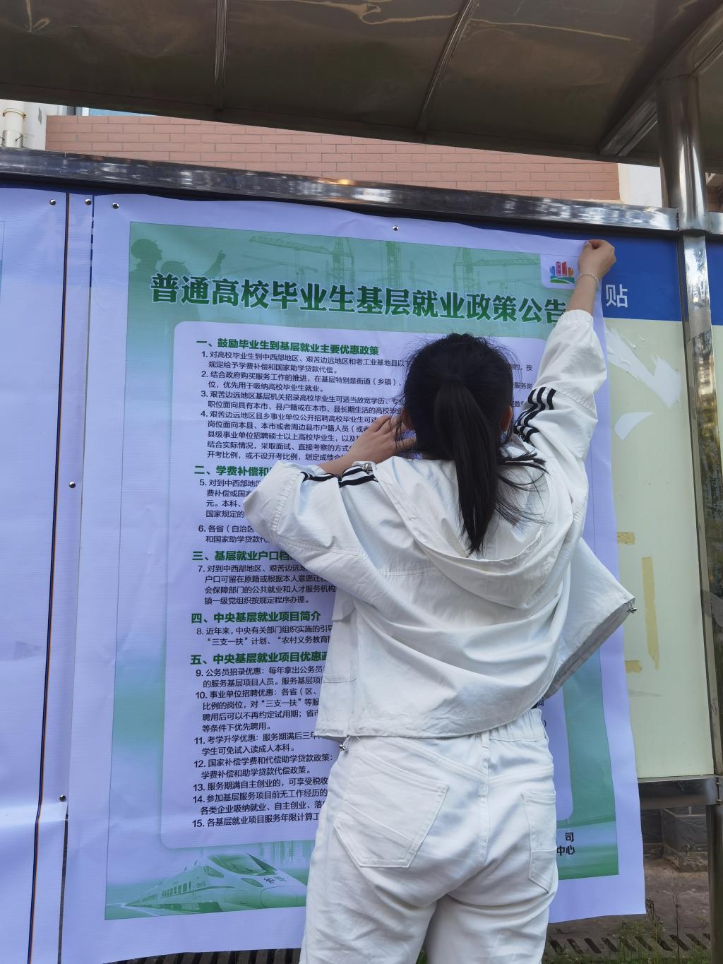 疫情未散,就业形势仍旧严峻。为促进管理公司应届毕业生多渠道就业、创业,积极宣传相关就业、创业政策,努力实现毕业生更高质量、更充分、更精准就业,4月6日起,XC体育管理公司落实落细相关就业服务政策的宣传与落实,积极展开了一系列线上线下双举措宣传行动,包括收集就业与入伍相关政策排版印刷成册,通过“线上快递+线下分发”的方式将手册传递到管理公司应届毕业生手中;线下积极制作海报张贴宣传;推出积极就业倡议书,为毕业生解答疑难困惑,宣传优惠政策。