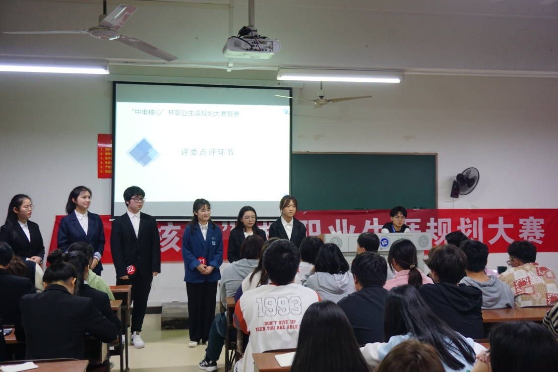 比赛开始前,主持人致开场词并介绍了出席本次复赛的评委。此次复赛分为两部分,第一部分由四组选手进行4分钟的个人职业生涯规划PPT展示,第二部分是观众互动环节。在个人PPT展示环节中,选手们通过精美绝伦的PPT演示和自己娓娓道来的演讲从个人分析,环境分析,职业目标定位以及计划与实施四个方面来展示了自己的职业生涯规划历程。他们在这一环节中,为了给评委留下深刻的印象,充分将自己的亮点展现在评委面前。在小组展示结束之后,三位评委老师轮流为每组选手的职业生涯规划书以及他们在赛场上的表现进行了5分钟的针对性评价,并给每位选手提出了中肯的建议。选手们耐心倾听,虚心请教,充分认识到了自己的问题。在工作人员计分空隙,主持人与观众进行了游戏互动,现场的气氛热闹非凡,互动游戏点燃了每一位观众,观众们都积极参与进来,同时也舒缓了候场选手们紧张的心情。伴随着主持人的结束语与观众的掌声本次“中电核心”杯职业生涯规划大赛复赛圆满落幕。