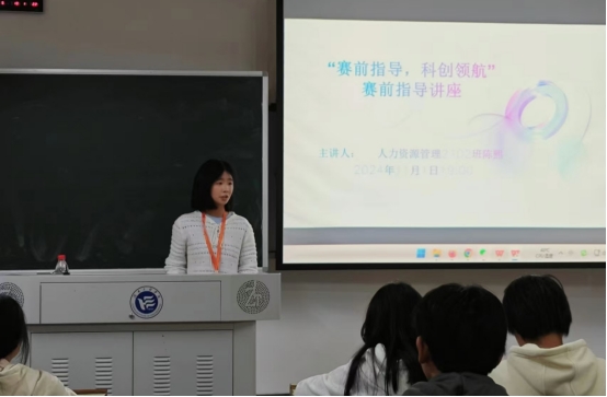 宣讲会伊始,创新创业部部长舒畅上台发言,对集团领导、宣讲人及管理公司第十一届”挑战杯”各大参赛队伍负责人的到来表示热烈欢迎。随后,陈熙学姐以“赛前指导,科创领航”为主题,分享自己对于项目申报书及参赛论文编写的一些见解。